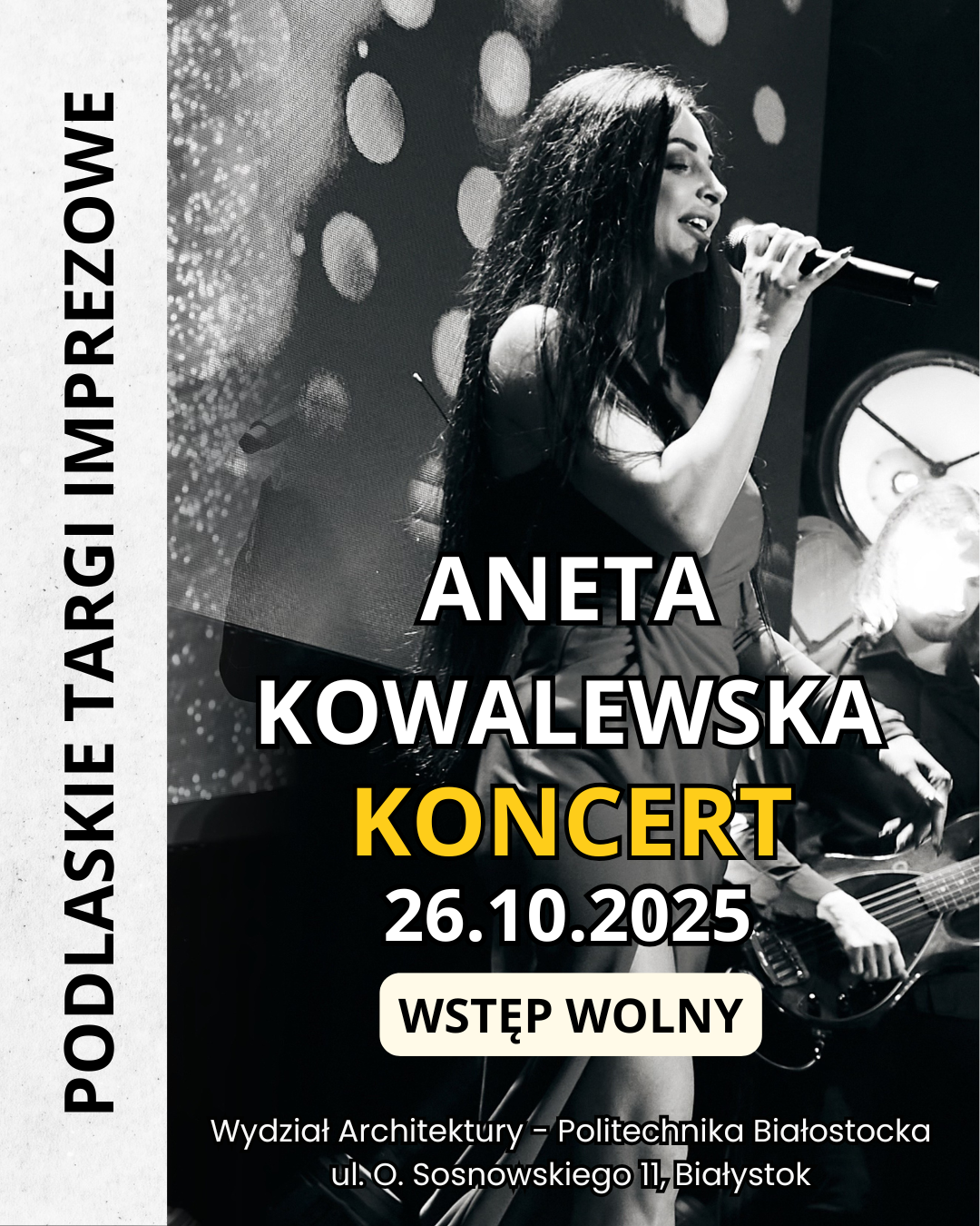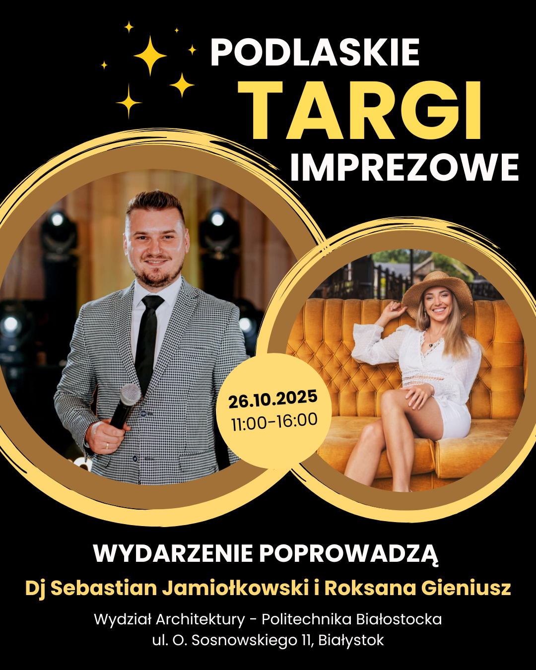 Podlaskie Targi Imprezowe Dni Godzin Minut WSTĘP WOLNY!WYDZIAŁ ARCHITEKTURY POLITECHNIKI BIAŁOSTOCKIEJ WYDARZENIE Z USŁUGAMI ZWIĄZANYMI Z PRZYGOTOWANIEM SIĘ I UCZESTNICZENIEM WE WSZELKICH IMPREZACH OKOLICZNOŚCIOWYCH! ŚLUB | WESELE | KOMUNIA | CHRZCINY | URODZINY | ANDRZEJKI | I INNE HARMONOGRAM WYDARZENIA Wydarzenie poprowadzą: Dj Sebastian Jamiołkowski i Roksana Gieniusz WYSTAWCY Podczas targów zaprezentowane zostaną usługi z różnych branż. Zobaczą Państwo m.in: PATRONI WYDARZENIA Wydarzenie zostało objęte następującymi patronatami: Miejsce wydarzenia Wydział Architektury Politechniki Białostockiej Oskara Sosnowskiego 11, 15-893 Białystok, PolskaParking: bezpłatnyDojazd bezpośredni: autobus linia 20 (przystanek: Sosnowskiego/Wyszyńskiego oraz Sosnowskiego/GrunwaldzkaAutobusy w pobliżu: 1, 4, 8, 10, 14, 17, 19, 26, 28, 29 Poprzednia edycja Podlaskie Targi Imprezowe w Restauracji Nastroje, Hotel 3trio w Białymstoku